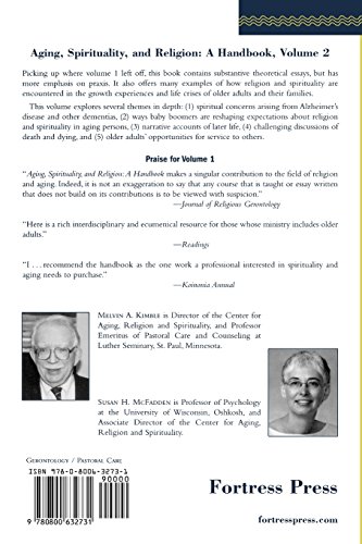 Aging, Spirituality, and Religion, Volume 1 published in 1995 by Fortress Press, provided the sociological, psychological, and theological perspectives for examining the ways in which spirituality and religion are experienced by aging persons in our society. As such, it provided the theoretical foundations for considering aging, spirituality and religion. Volume II picks up where Volume I left off-with practical advice and tools for ministry with the aging in a variety of settings. Gerontological and theological perspectives undergird the practical guidance and a final section treats of the unique ethical issues involved in ministry with the aging. Contributors: Melvin A. Kimble, Susan H. McFadden, Lynn Huber, Jane Thibault, Robert Atchley, Christie Cozad Neuger, John Stuckey, Henry Simmons, Anne E. Streaty Wimberly, W. DuWayne Battle, Ellen L. Idler, Dayle A. Friedman, Douglas Olson, Mark Holman, Richard Morgan, James Seeber, Marty Richards, Nancy G. Devor, Ken I. Pargament, Lois Knutson, Robert H. Albers, Robert Rost, Elizabeth MacKinlay, Helen Black, James Ellor, Carole Bailey Stoneking, Paul Sponheim, Richard Wallace, Richard Address, Stephen Sapp, Ladislav Volicer, Paul R. Brenner, James Birren, Betty Birren, Jeff Levin, John McFadden, Harry R. Moody, and Thomas Cole.Used Book in Good Condition