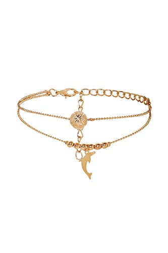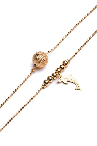 * Never wear anklets with pantyhose or tights, but on bare legs only.Feminine multilayer ball chain anklet of golden tone with two charms, globe and cute dolphin pendant, attached to the row of small balls.