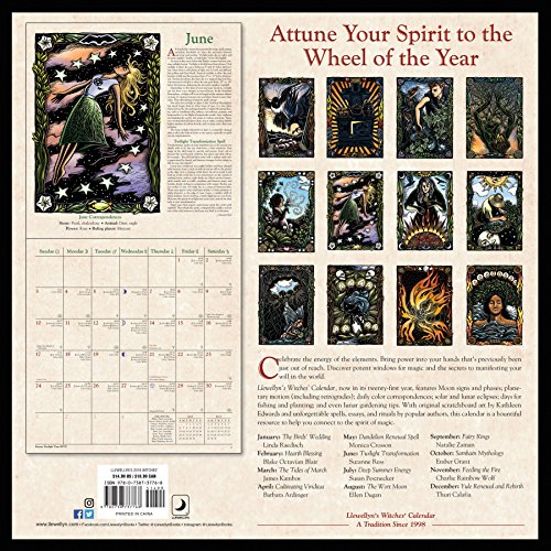 Llewellyn’s Witches’ Calendar, now in its 21st year, features Moon signs and phases; planetary motion (including retrogrades); daily color correspondences; solar and lunar eclipses; days for fishing and planting; and even lunar gardening tips. With original scratchboard art by Kathleen Edwards and unforgettable spells, essays, and rituals by popular authors, this calendar is a bountiful resource to help you connect to the spirit of magic.